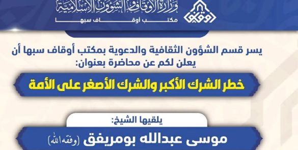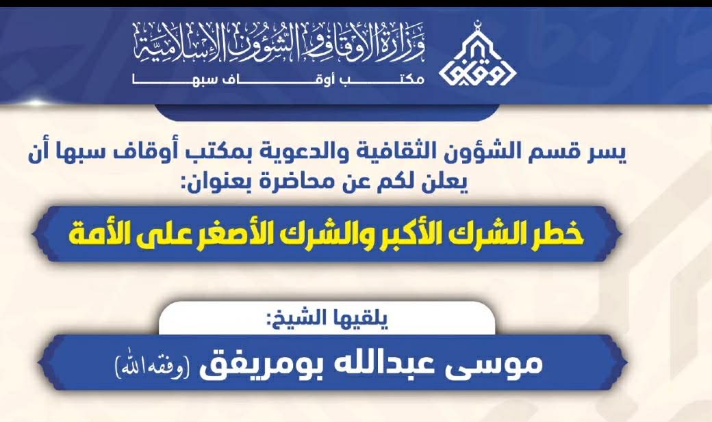 دعا قسم الشؤون الثقافية والدعوية بمكتب الأوقاف والشؤون الإسلامية سبها المواطنين إلى حضور محاضرة علمية بعنوان “خطر الشرك الأكبر والأصغر على الأمة”، وذلك ضمن سلسلة من الأنشطة الدعوية التي ينفذها
