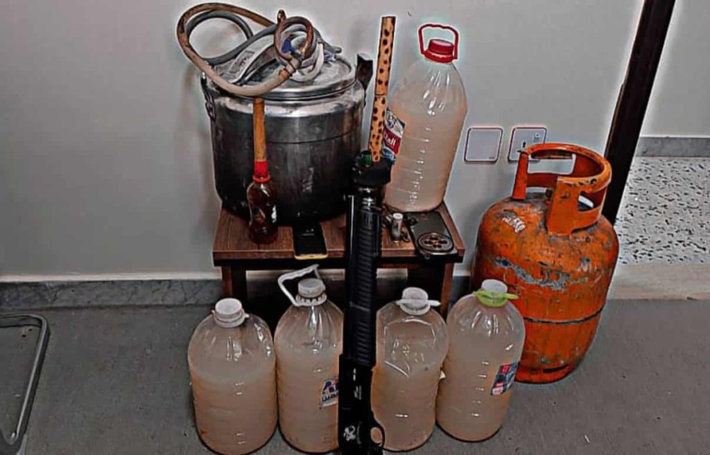وجاءت العملية بعد استصدار إذن من النيابة العامة ومداهمة الموقع، حيث عُثر بحوزة المعني على خمس قنينات سعة 6 لترات من الخمور، وسلاح ناري نوع خرطوش، إضافة إلى أداة تستعمل في تعاطي مادة الحشيش.