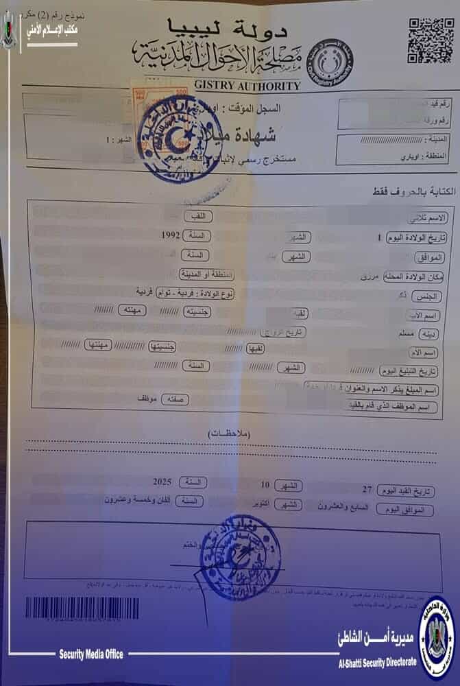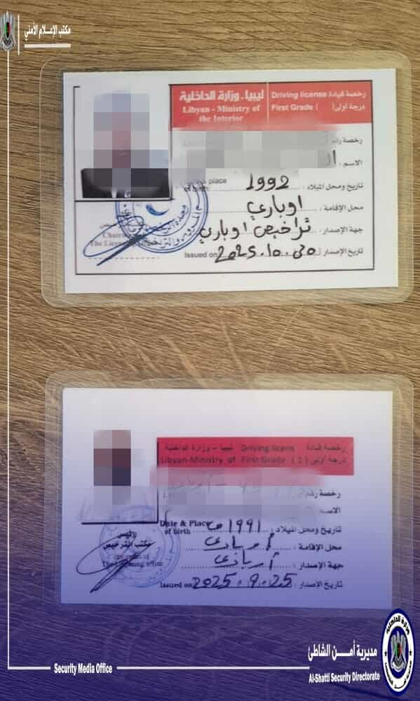 وجاءت عملية القبض، خلال استيقاف أمني اعتيادي لمركبة آلية قادمة من مدينة سبها ومتجهة نحو مدينة طرابلس، وعند التحقق من إثباتات الهوية الخاصة بالركاب، تبيّن أن اثنين منهما يحملان رخص قيادة وشهادة ميلاد يُشتبه في تزويرها صادرة من مدينة أوباري.