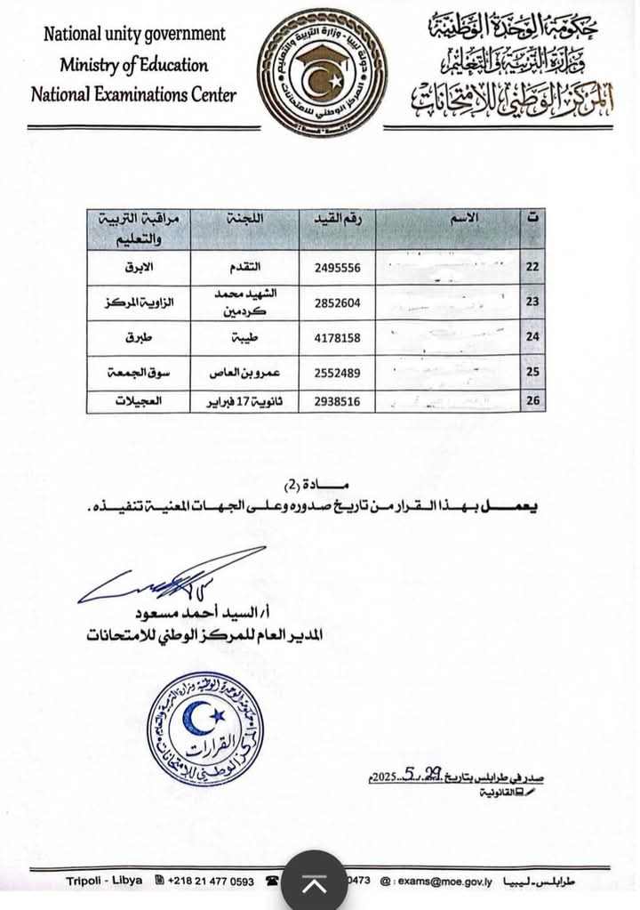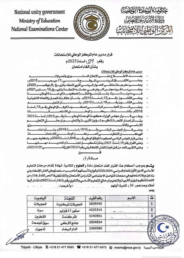 قرر مدير عام المركز الوطني للامتحانات إلغاء امتحان عدد 26 تلميذا في مادة العلوم و16 تلميذا في مادة الجغرافيا من طلبة شهادة إتمام مرحلة التعليم الأساسي الدور الأول للعام الدراسي 2025/2024م.