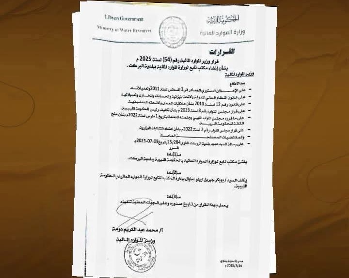 عمر بن خيلب أعلن وزير الموارد المائية بالحكومة الليبية، قرار رقم ‘ 45 ‘ لسنة 2025 ، بشأن إنشاء مكتب للموارد المائية في بلدية البركت، بهدف تعزيز إدارة الموارد المائية وتحسين جودة الخدمات المقدمة للمواطنين في المنطقة. ويأتي هذا القرار ضمن الجهود الحكومية الرامية إلى تحسين البنية التحتية للمياه وضمان توفير المياه الصالحة للاستخدام الزراعي والمنزلي، ومواجهة التحديات المتعلقة بندرة المياه في مناطق الجنوب.