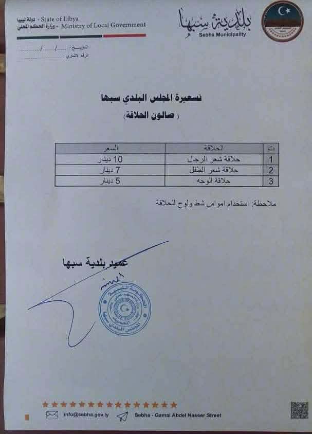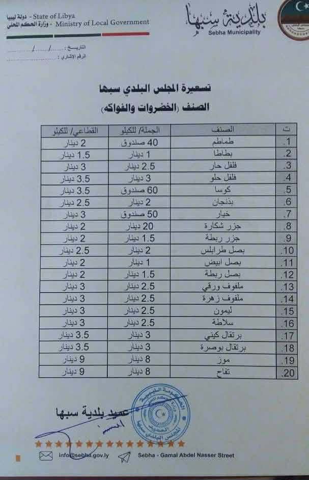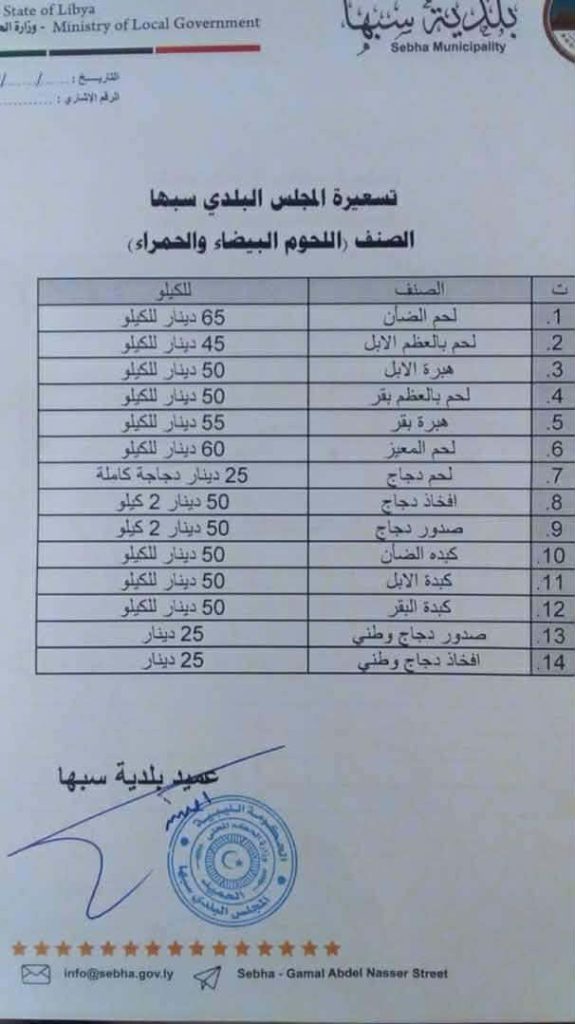 أعلنت بلدية سبها عن اعتماد تسعيرة رسمية لعدد من السلع الغذائية والخدمات داخل نطاقها الإداري، وذلك في إطار جهودها الرامية إلى تنظيم السوق المحلي، وضبط الأسعار، والحد من التجاوزات، بما يضمن حماية المستهلك وتحقيق قدر من الاستقرار في المعاملات التجارية.