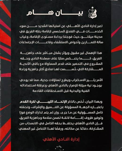كما حمّلت الإدارة الاتحاد الليبي لكرة القدم المسؤولية الكاملة عن هذه الظروف، بصفته الجهة المنوط بها التنسيق والإشراف على ترتيبات الإقامة والتنظيم، مؤكدة أن ” النادي الأهلي يحتفظ بحقه الكامل في الانسحاب من المشاركة، دفاعاً عن مكانته، ورفضاً لهذا التعامل غير المهني” ، ما لم يُجرَ تدارك الوضع فوراً وتوفير ظروف إقامة لائقة تضمن سلامة الفريق واستعداده الفني والبدني.