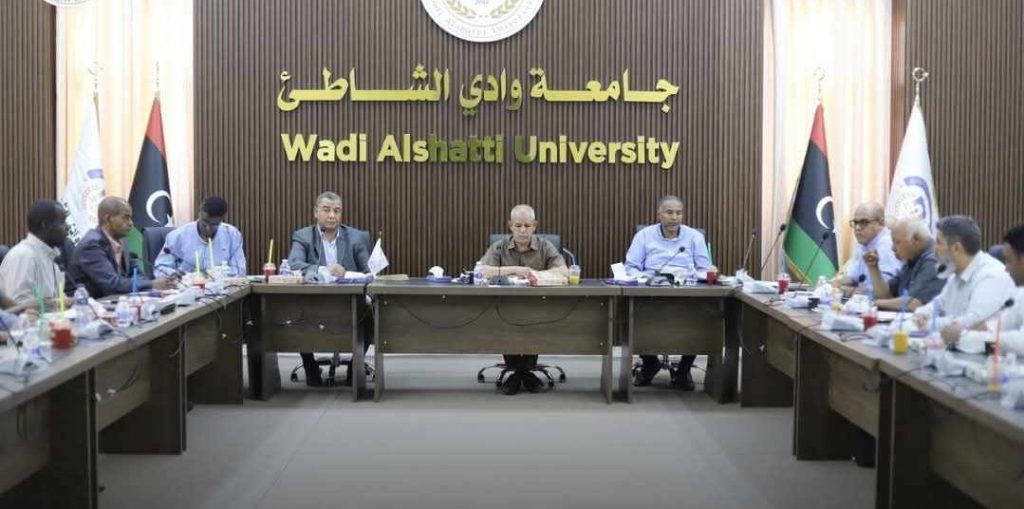 عقد مجلس جامعة وادي الشاطئ اجتماعه الدوري السادس برئاسة رئيس الجامعة عبدالسلام المثناني بديوان الإدارة العامة للجامعة وبحضور وكيل الشؤون العلمية خالد الغنمي، وأعضاء المجلس العمداء، والكاتب العام والمسجل العام بالجامعة.