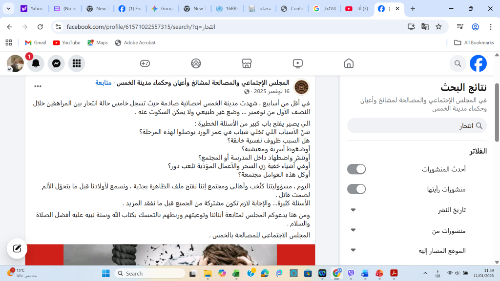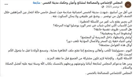 في 16 نوفمبر 2025 نشر المجلس الاجتماعي والمصالحة لمشائخ وأعيان وحكماء مدينة الخمس ( شرق العاصمة الليبية طرابلس) منشورا يتحدث عن تسجيل خمس حالات انتحار خلال النصف الأول من نوفمبر 2025 وأن المدينة تشهد إحصائية صادمة واصفا بأن الوضع غير طبيعي ولا يمكن السكوت عليه