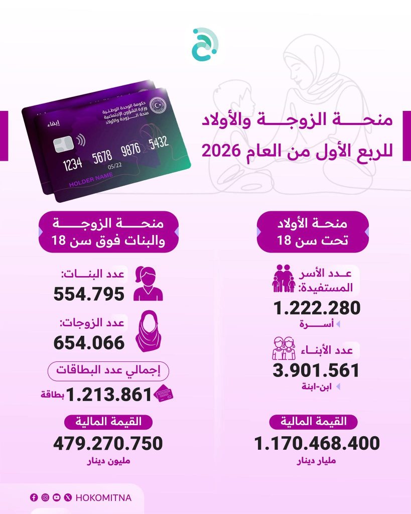 أحالت وزارة الشؤون الاجتماعية بحكومة الوحدة الوطنية، قيمة منحة الزوجة والأولاد للربع الأول من عام 2026 إلى المصارف التجارية.
