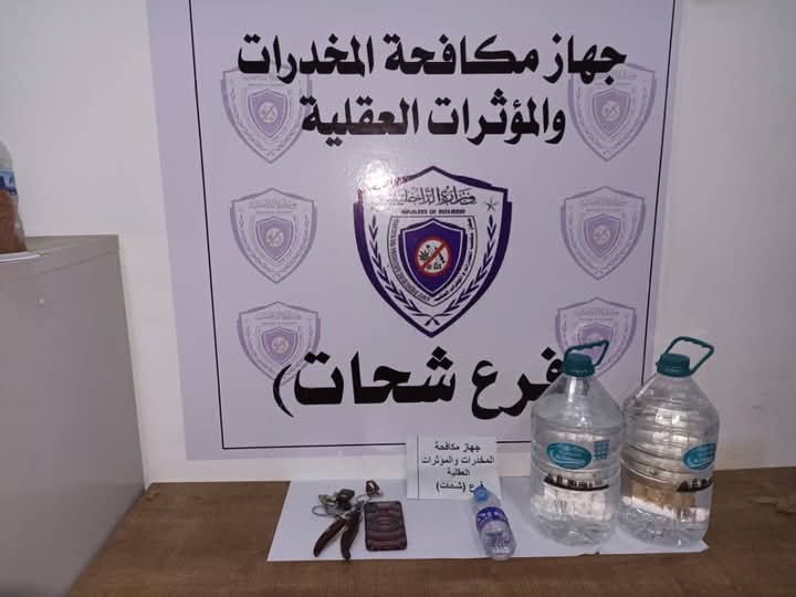 ألقى أعضاء فرع جهاز مكافحة المخدرات والمؤثرات العقلية بمدينة شحات، القبض على المدعو ‘ر. ج. س. ا ‘ ، من مواليد 1985 ومن سكان مدينة البيضاء، وذلك بعد ضبطه متلبسًا بحيازة مواد مسكرة.