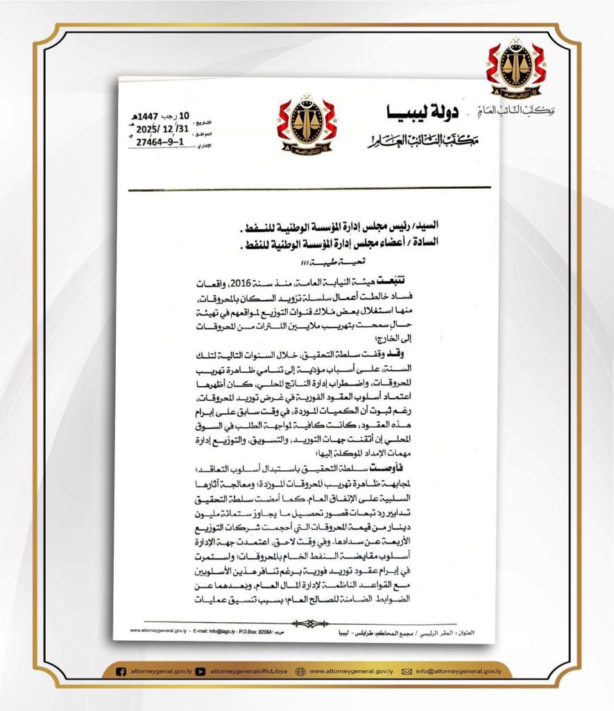 وفي هذا الإطار، خاطبت النيابة العامة مجلس إدارة المؤسسة الوطنية للنفط لاتخاذ تدابير معالجة، تضمنت استبدال أسلوب التعاقد وتعزيز شفافية الإنفاق وإجراء مناقصة عامة لعقود توريد المحروقات لسنة 2026. واستجابت المؤسسة وشرعت في تنفيذ التدابير، ما أدى إلى انخفاض قيمة العلاوات المدفوعة لوقود الديزل إلى دولار واحد للطن المتري، ولوقود البنزين إلى ما دون دولار واحد، مما يحقق توفير عشرات المليارات من الدينارات ويخفض كلفة استيراد المحروقات.
