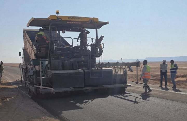 باشرت فرق جهاز تنفيذ المشروعات والمواصلات الليبية، أعمال فرش طبقة الإسفلت في القطاع الثالث من طريق أوباري – غات، الذي يبعد حوالي 107 كم عن مدينة أوباري.