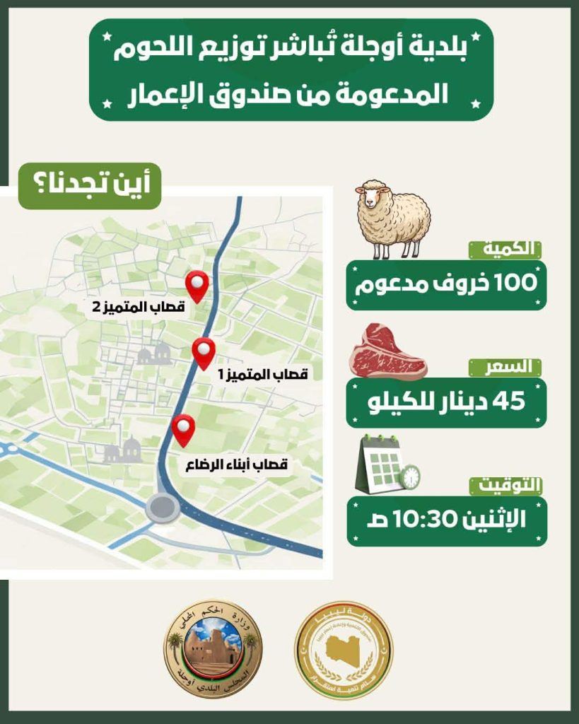 حيث تم توفير (100 خروف) سيتم طرح لحومها للبيع بسعر (45 ديناراً للكيلو)، مشير إلى ان عملية التوزيع ستتم عبر القصابين المعتمدين في المواقع التالية: قصاب المتميز (الفرع الأول): بجوار محطة وقود أوجلة، وقصاب المتميز (الفرع الثاني): مقابل مسجد سيدي صالح، بالإضافة إلى قصاب أبناء الرضاع، مقابل مسجد القدس.