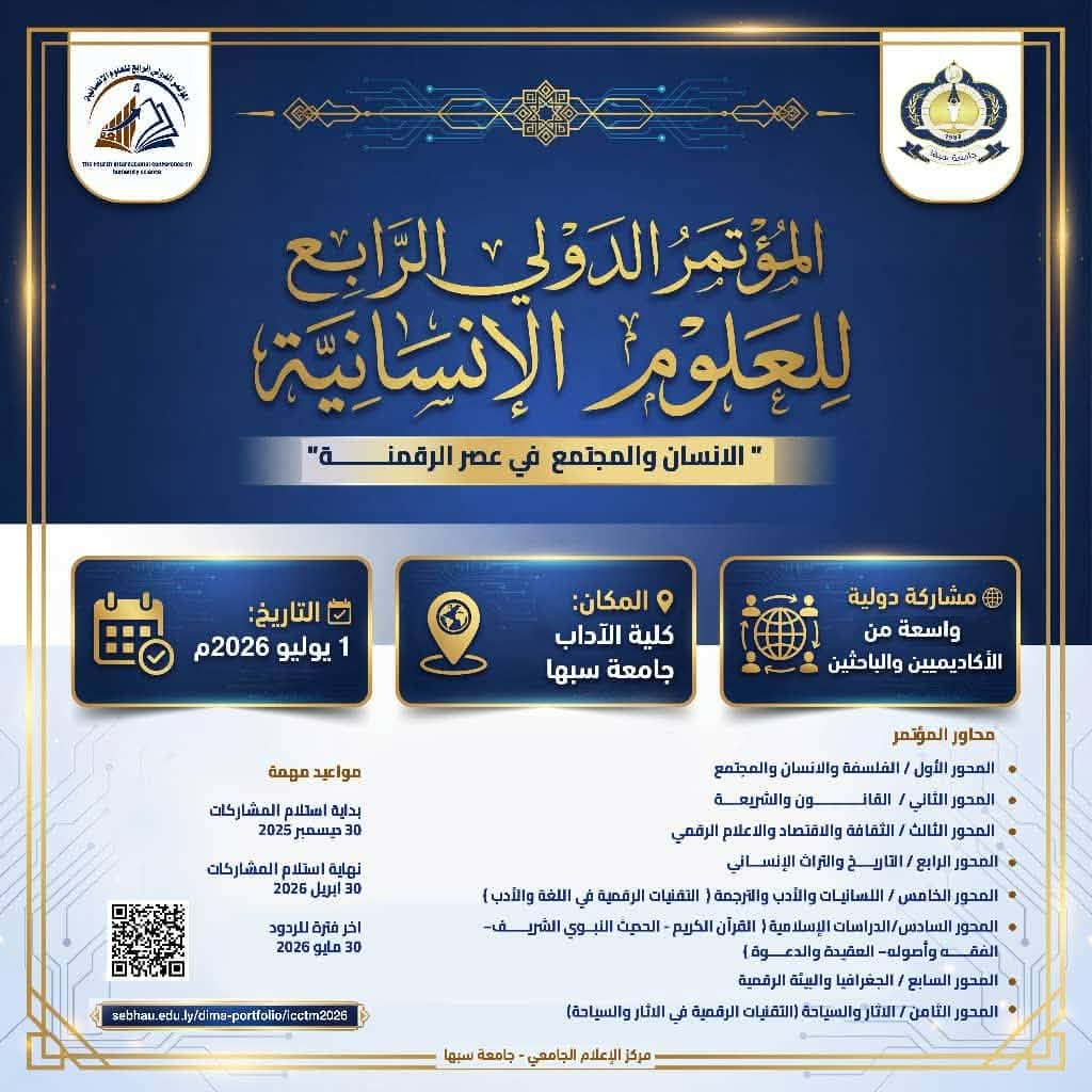 تطلق جامعة سبها في الأول من يوليو 2026م، فعاليات المؤتمر الدولي الرابع للعلوم الإنسانية، الذي تستضيفه كلية الآداب تحت شعار ” يربط الفكر الإنساني بالتحول الرقمي“.