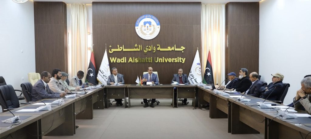 عقد مجلس جامعة وادي الشاطئ، اجتماعه الدوري برئاسة ‘د. ناصر أبوهمود’ رئيس الجامعة، و بحضور وكيل الشؤون العلمية ‘د. خالد الغناي’، والكاتب العام، وعمداء الكليات، والمسجل العام، إلى جانب عدد من القيادات الأكاديمية والإدارية بالجامعة.