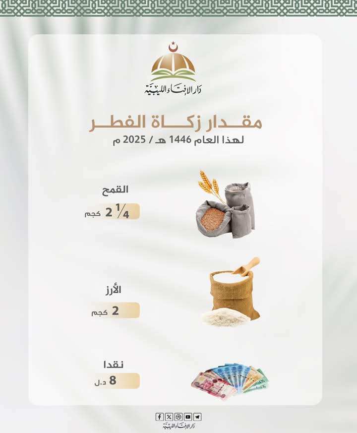 حددت دار الإفتاء مقدار زكاة الفطر للعام الحالي بـ 8 دنانير ليبية نقدًا، ومن الحبوب ‘ 2 ‘ كيلو وربع من القمح ، و’ 2 ‘ كيلو من الأرز عن الشخص الواحد.