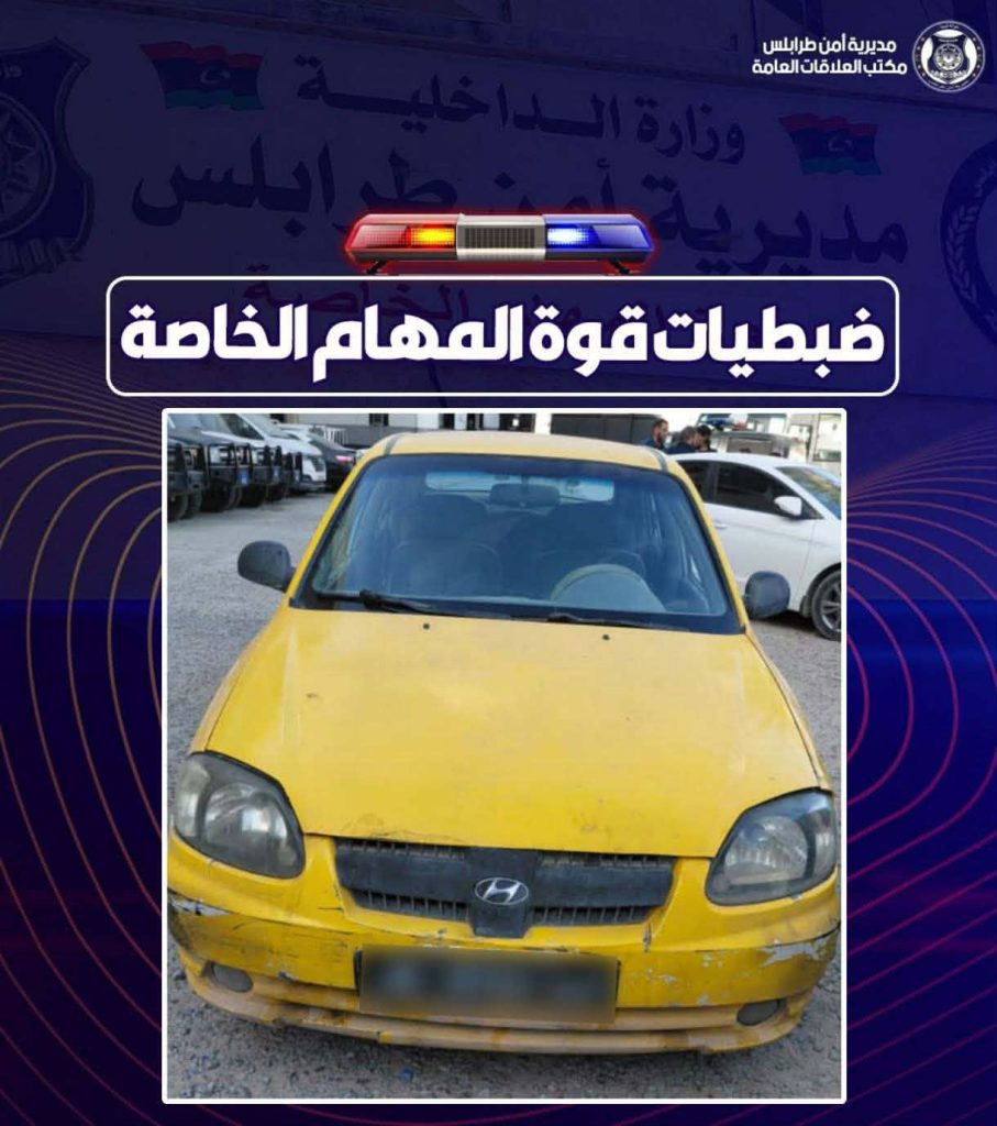 تمكنت قوة المهام الخاصة بمديرية أمن طرابلس، من ضبط مركبة نوع (هونداي فيرنا – لون أصفر)، وذلك من خلال الإستيقافات الأمنية المنتشرة داخل العاصمة.