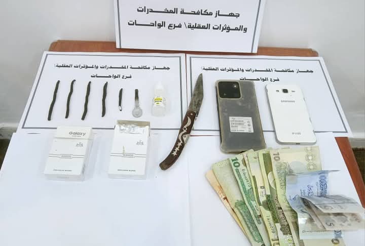 تمكنت دوريات التحري التابعة لجهاز مكافحة المخدرات والمؤثرات العقلية فرع الواحات، من ضبط شخص مشتبه به بحوزته كمية من المواد المخدرة