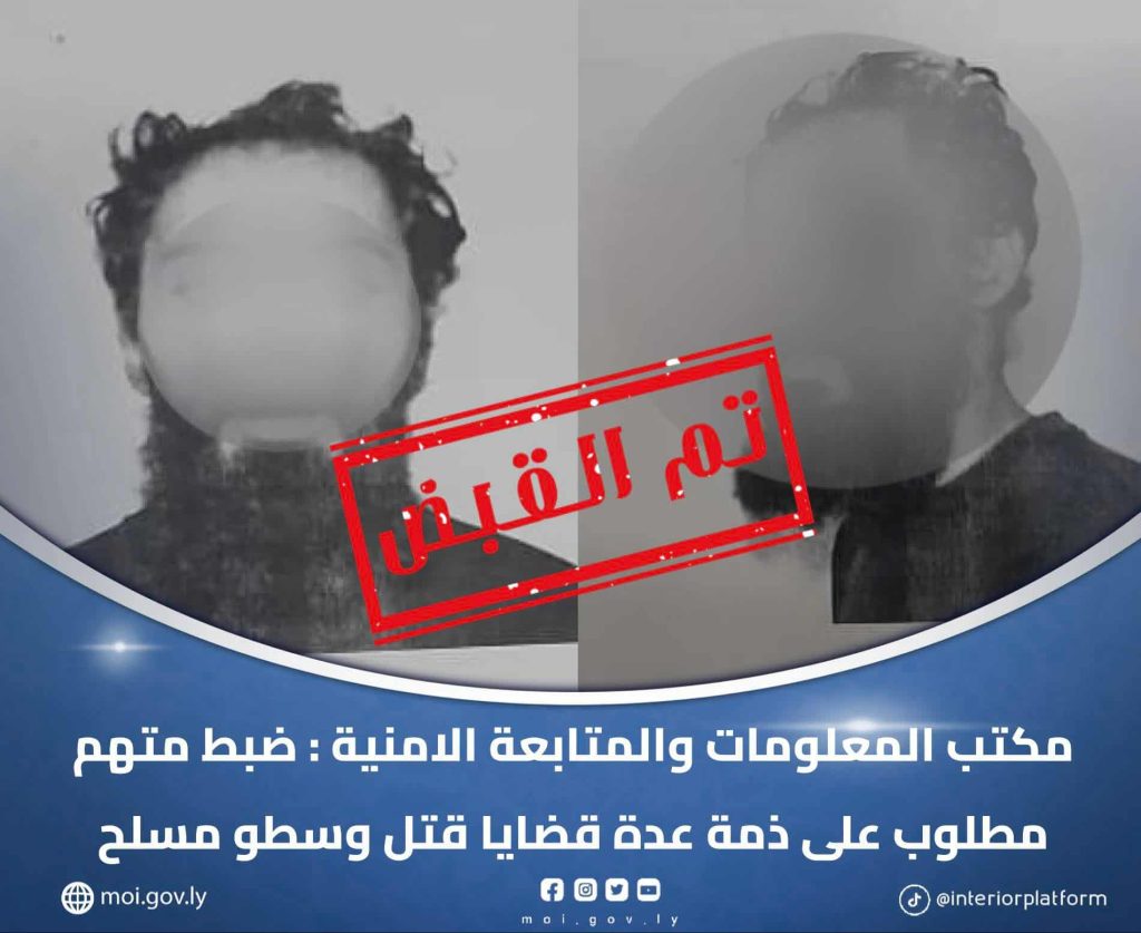 تمكّن أعضاء التحري بمكتب المعلومات والمتابعة الأمنية بوزارة الداخلية بحكومة الوحدة الوطنية ،من القبض على المدعو ‘م.ع.ك ‘، المطلوب على ذمة عدة قضايا.