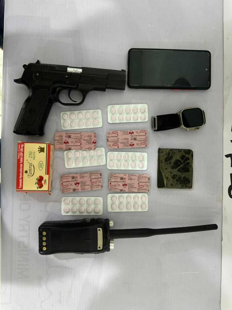 وخلال عملية الضبط، عثر بحوزتهما على مائة قرص من مخدر الترامادول وقطعة كبيرة من مادة الحشيش تقدر بنصف “باسبورت”، إضافة إلى مسدس تركي عيار 9 ملم وجهاز لاسلكي.