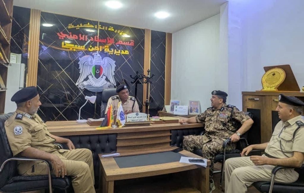 استقبل مدير أمن سبها اللواء خالد البسطة، برفقة مساعديه للشؤون العامة والأمنية، رئيس ديوان وزارة الداخلية بالمنطقة الجنوبية، اللواء عبدالسلام الشريف، في زيارة رسمية تهدف لمناقشة الوضع الأمني في المدينة.