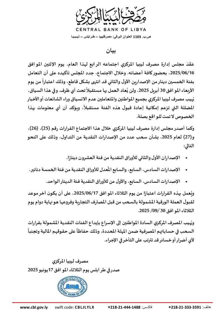 وأكد المركزي على ان أخر موعد لقبول العملة الورقية المسحوبة من التداول هو يوم الثلاثاء الموافق 30 /9 / 2025 . وطالبت إدارة الإصدار بمصرف ليبيا المركزي بالمواطنين ممن لديهم مبالغ مالية من هذه العملة التوجه للمصارف التجارية لاستبدالها او إيداعها بحساباتهم وذلك حفاظا علي حقوقهم المالية وتجنبا لأي أضرار أو خسائر قد يترتب في التأخر في الإجراء .