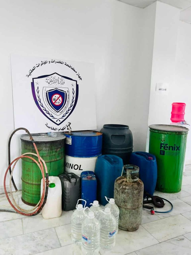 تمكنت قوة المهام التابعة لجهاز مكافحة المخدرات والمؤثرات العقلية من ضبط شخص بحوزته مصنع متكامل لتصنيع الخمور المحلية داخل منزله بمدينة بنغازي .