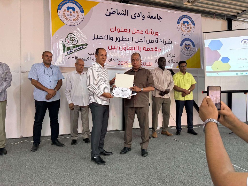 شرعت جامعة وادي الشاطئ، بالتعاون مع مكتب ضمان الجودة وتقييم الأداء ومركز الريادة والابتكار بالجامعة ، في تنفيذ ورشة عمل بعنوان :”شراكة من أجل التطور والتميز” .