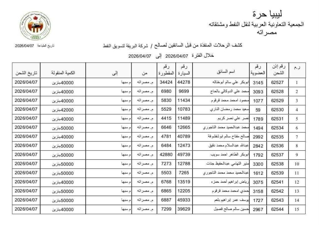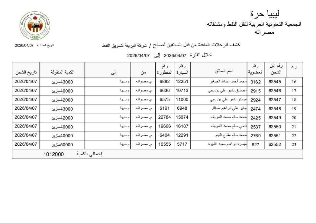 أعلن مستودع سبها النفطي وصول كميات من الوقود قادمة من مستودع مصراتة، بإجمالي بلغ (1,012,000) لتر، وذلك في إطار دعم استقرار الإمدادات النفطية بالمنطقة الجنوبية.