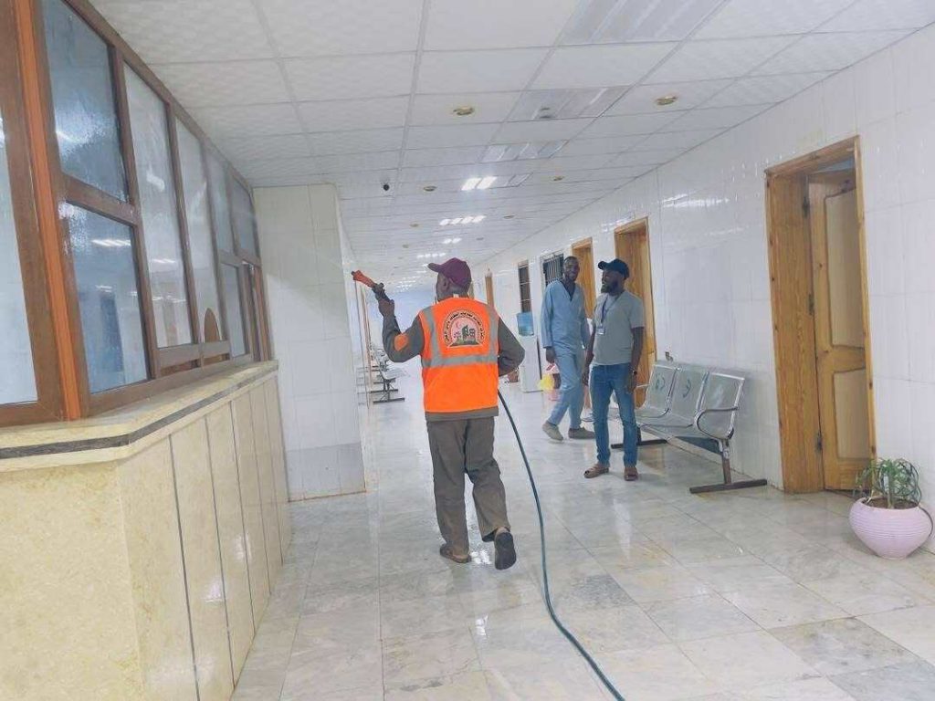 تابع المكلف بتسيير شؤون الوكيل ببلدية الغريفة أبوبكر عبدالهادي ،مع موظفي فرع شركة الخدمات العامة للنظافة، سير أعمال الرش والتعقيم داخل مستشفى الغريفة القروي، وذلك عقب الطفح الذي شهدته شبكات مياه الصرف الصحي بالموقع.