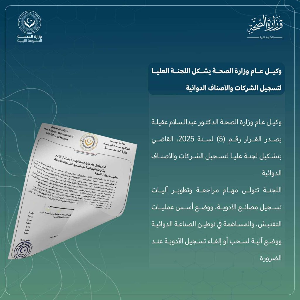 أصدر وكيل عام وزارة الصحة بالحكومة الليبية عبدالسلام عقيلة القرار رقم (5) لسنة 2025. يقضي بتشكيل لجنة عليا لتسجيل الشركات والأصناف الدوائية، برئاسة مدير إدارة الصيدلة والتجهيزات والمعدات والمستلزمات الطبية، وعضوية عدد من المختصين في المجال.