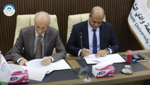 فسانيا : حليمة حسن احتضنت الإدارة العامة بجامعة وادي الشاطئ، توقيع اتفاقية تعاون أكاديمي وعلمي بين جامعة وادي الشاطئ وجامعة طرابلس، وذلك في إطار ترسيخ ثقافة الشراكة بين مؤسسات التعليم العالي في ليبيا.وحضر مراسم التوقيع، رئيس جامعة طرابلس ‘د. خالد عون ‘، ورئيس جامعة وادي الشاطئ ‘د. ناصر أبوهمود ‘، إلى جانب وكيل الشؤون العلمية، والكاتب العام، وعمداء الكليات، ومديري المراكز والإدارات والمكاتب بالجامعة.يتضح ان مراسم التوقيع جاءت ضمن الزيارة الرسمية التي قام بها وفد من جامعة طرابلس، والذي ضمّ نخبةً من أعضاء هيئة التدريس والقيادات الأكاديمية، في خطوة تعبّر عن حرص الجامعتين على تعزيز التعاون المؤسسي وتبادل
