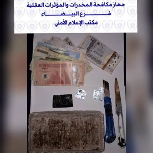 تمكن أعضاء جهاز مكافحة المخدرات والمؤثرات العقلية فرع البيضاء ، من ضبط شخصين أثناء قيامهما بترويج المواد المخدرة داخل المدينة.اوضح المكتب الإعلامي بالجهاز، ان المضبوطين هما ‘ إ. م. إ’، و ‘ح. م. م’، حيث عُثر بحوزتهما على قطعة متوسطة الحجم من مخدر الحشيش، إلى جانب أداتين حادتين تُستخدمان في تقطيع الحشيش، إضافة إلى ثمانية أقراص مخدرة من نوع ‘أبترل’.مؤكدا انه جرى التحفظ على المضبوطات واتخاذ كافة الإجراءات القانونية اللازمة حيال الواقعة، مع إحالة المعنيين بالأمر إلى الجهات المختصة لاستكمال التحقيقات وفق القوانين المعمول بها.