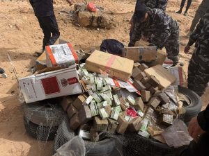 تمكنت فرق مكتب التحريات بمكتب غات التابع لفرع المنطقة الجنوبية بجهاز مكافحة المخدرات والمؤثرات العقلية، من ضبط أحد المهربين بمنطقة الفيوت على الشريط الحدودي الليبي – الجزائري، وذلك عقب الاشتباه في حمولة كانت بحوزته. وفقاً لمكتب الإعلام الأمني، أن عملية الضبط أسفرت عن العثور على 39 صندوقًا يحتوي على نحو 19,500 علبة من سجائر نوع (إتش بي)، كانت معدّة للتهريب خارج البلاد، ومحملة على ثماني دواب في محاولة لتمريرها عبر المسالك الصحراوية الوعرة. يذكر أنه اتخذت الإجراءات القانونية اللازمة حيال الواقعة، وإحالة المضبوطات والمتهم إلى الجهات المعنية لاستكمال التحقيقات.