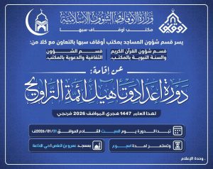 فسانيا : حليمة حسن عيسى أعلن قسم شؤون المساجد بمكتب أوقاف سبها، عن إقامة دورة علمية بعنوان ‘ اعداد وتأهيل ائمة التراويح’ لهذا العام 1447 هجري. يتضح ان الندوة بالتعاون بين قسم شؤون القرآن الكريم والسنة النبوية بالمكتب، وقسم شؤون الثقافية والدعوية بالمكتب. يشار إلى ان الندوة تقام بمسجد عمرو بن العاص الواقع بمحلة (المهدية_ حي الإذاعة)، وتستمر لمدة اسبوع كامل. تهدف هذه الندوة إلى تعزيز الثقافة الدينية وترسيخ المفاهيم الشرعية الصحيحة داخل المجتمع.